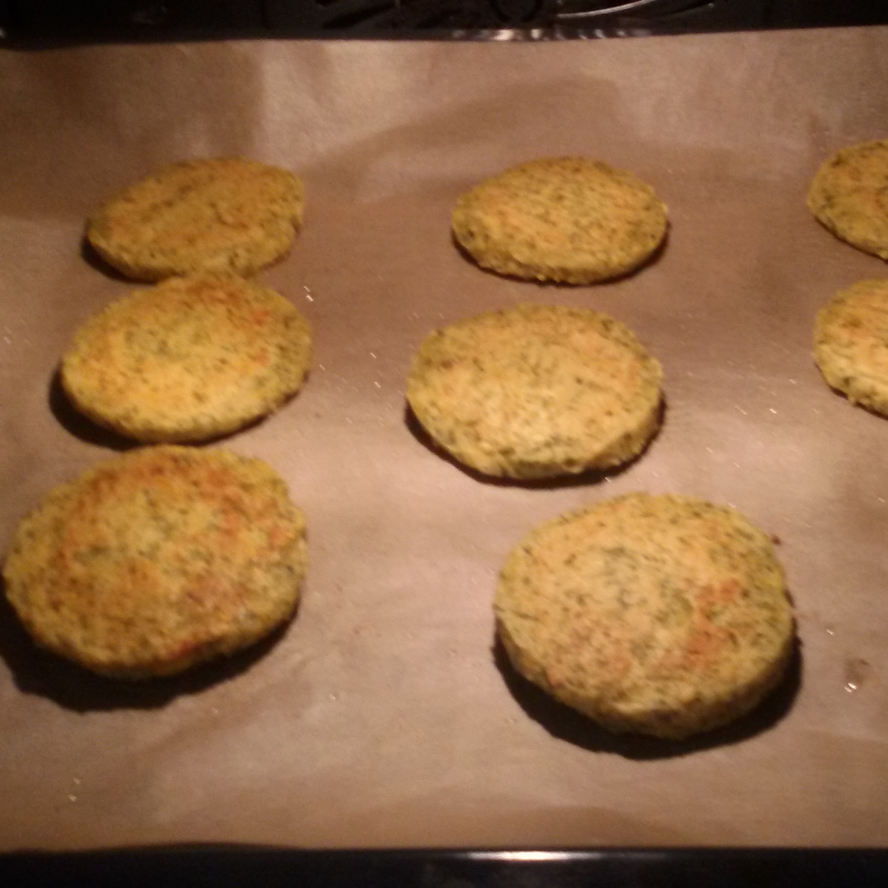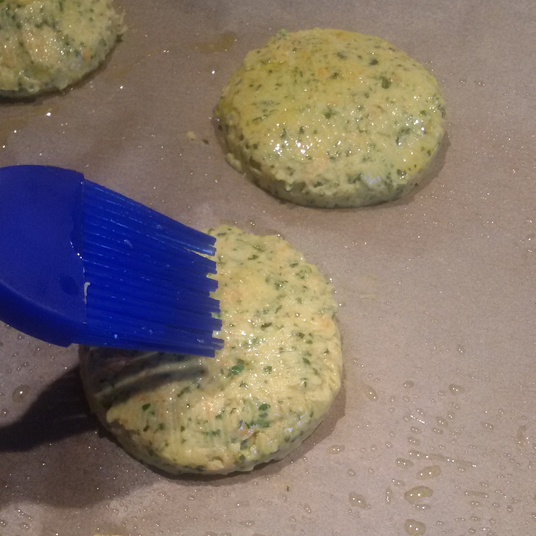 - Form mixture into 9 small patties (or 12 if you prefer smaller patties) and place into prepared oven tray. Brush some oil, this will make them go brown.